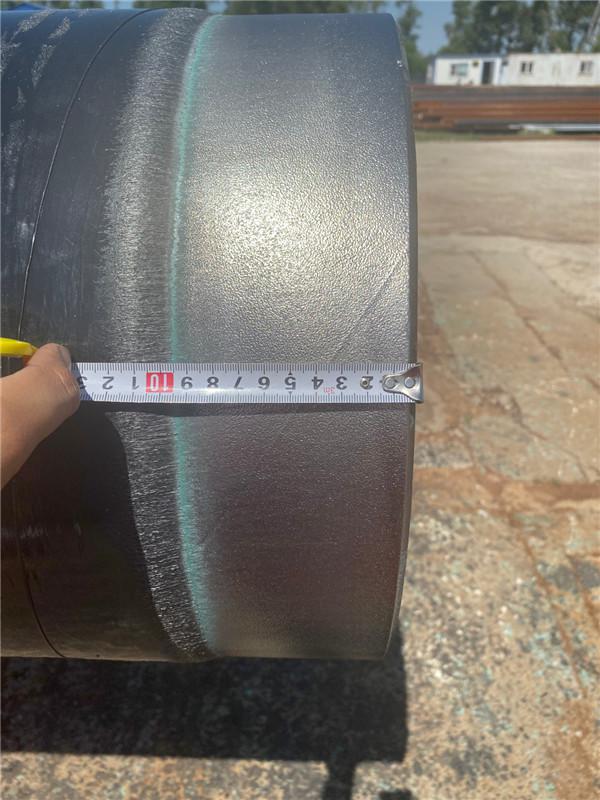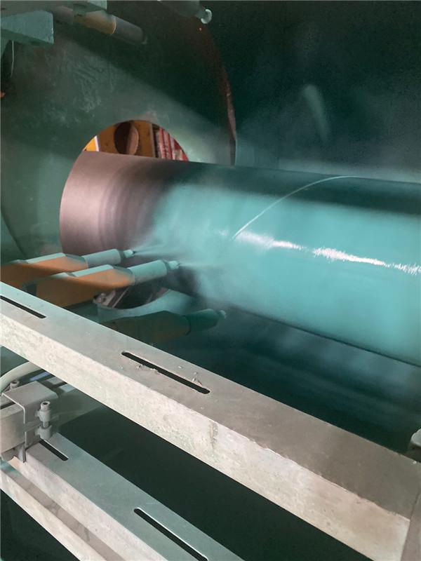 聚乙烯層包覆后,用水將鋼管冷卻至溫度不高于60℃。涂敷環(huán)氧粉末至對防腐層開始冷卻的間隔時間應(yīng)確保熔結(jié)環(huán)氧粉末涂層固化完全。采用循環(huán)水冷卻,啟動前應(yīng)檢查循環(huán)水泵是否完好,節(jié)約用水。防腐層外觀采用目測法逐根檢查;聚乙烯層表面應(yīng)平滑,無暗泡、麻點、皺折及裂紋,色澤應(yīng)均勻;使用磁性測厚儀測量鋼管圓周方向均勻分布的四點的防腐層厚度,其結(jié)果應(yīng)符合SY/T0413-2002《埋地鋼質(zhì)管道聚乙烯防腐層技術(shù)標(biāo)準(zhǔn)》表2.0.2的規(guī)定;防腐層的漏點采用在線電火花檢漏儀檢查,檢漏電壓為25kV,漏點檢測在涂層溫度低于90℃時進(jìn)行;通過采用端頭清理裝置除去管端部位的聚乙烯層,管端預(yù)留長度應(yīng)為100mm~150mm,按甲方要求和產(chǎn)品外觀美觀,統(tǒng)一預(yù)留100mm且聚乙烯層端面應(yīng)形成小于或等于30°的倒角;管端處理合格后的鋼管在管體的兩端纏繞隔離繩,防止鋼管之間在運(yùn)輸、倒運(yùn)過程中互相碰撞,損傷表面防腐材質(zhì)。經(jīng)質(zhì)量檢測合格的防腐管,粘貼產(chǎn)品標(biāo)簽和質(zhì)量合格證,并按同規(guī)格,同型號堆放在一起;合格品吊裝時采用寬度為150mm~200mm的尼龍帶或膠皮帶或用吊鉤掛鋼管的兩端,嚴(yán)禁用鋼絲繩直接作用于防腐層表面進(jìn)行吊裝作業(yè);吊裝過程中輕起輕放,行走平穩(wěn),嚴(yán)禁磕碰拖拉而損壞保護(hù)層;儲存場地設(shè)置管托和隔欄,管托應(yīng)高150mm;儲存區(qū)應(yīng)懸掛銘牌,銘牌上應(yīng)標(biāo)明鋼管規(guī)格、數(shù)量等;裝卸、倒運(yùn)防腐管時,采取保護(hù)措施,不得損壞防腐層。